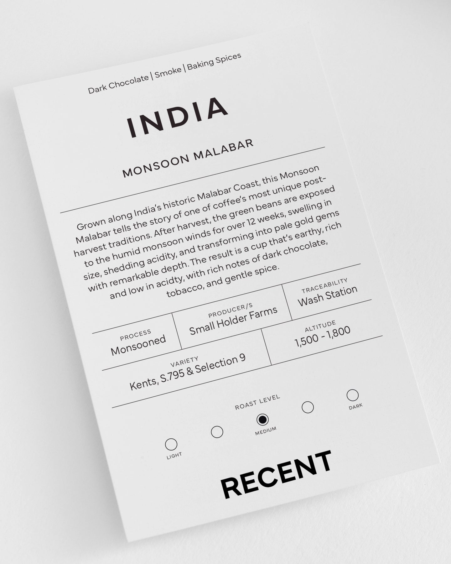 Expect a cup of considerable depth and texture: a core of dark chocolate richness gives way to smoke-tinged wood and tobacco notes, lifted by a gentle thread of baking spice. The medium roast builds structure and balance — not heavy or blunt, but firmly substantial, with low acidity and a clean, sustained finish. A bold yet composed coffee that embodies the craftsmanship and climate of India’s Malabar coast.