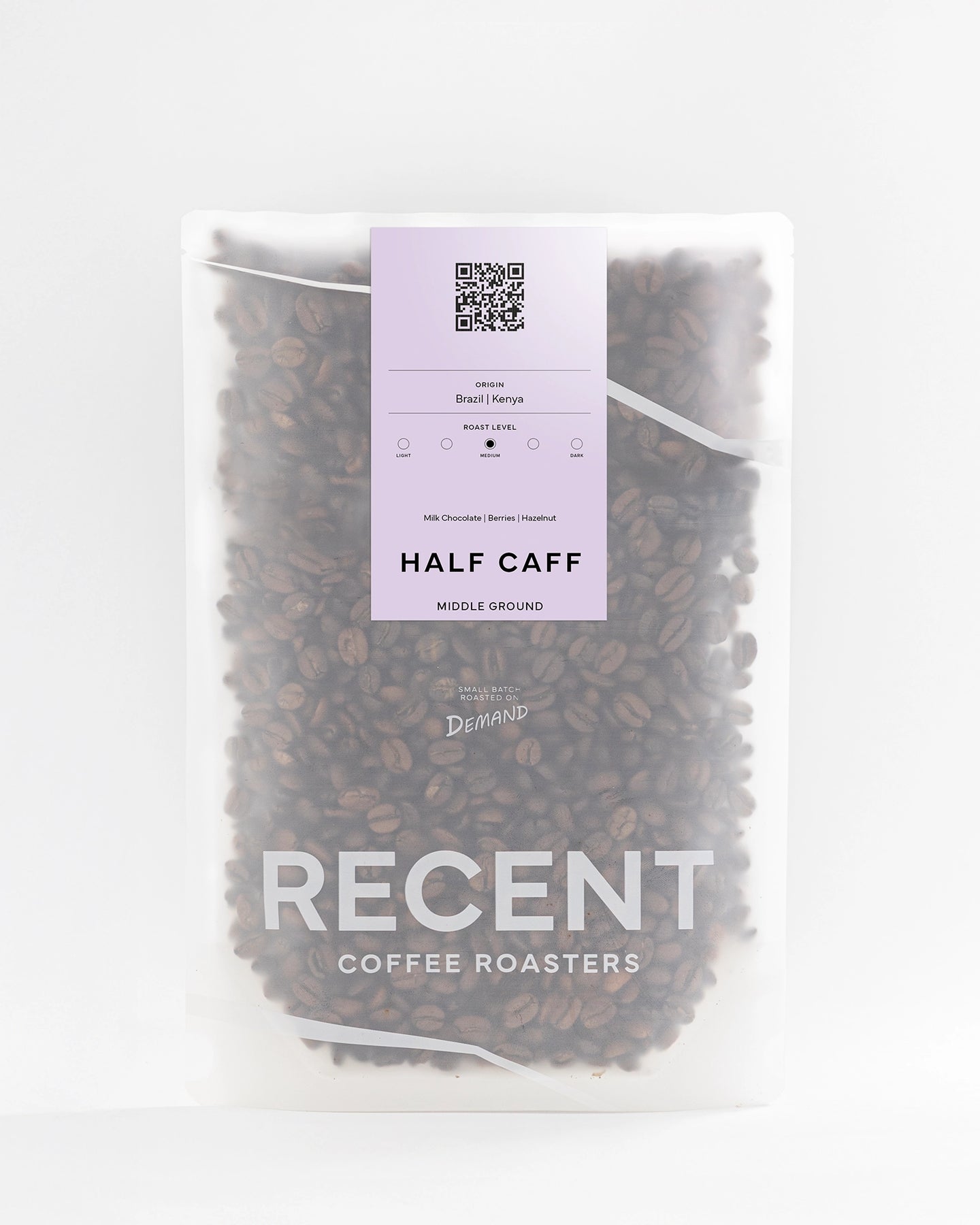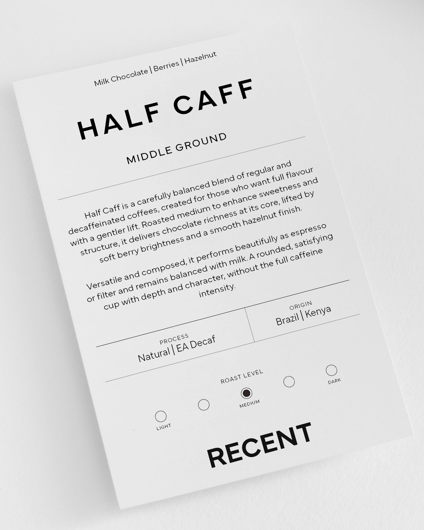 Expect a balanced and approachable coffee with milk chocolate sweetness, subtle berry brightness, and a smooth hazelnut finish. Full in flavour yet softer in caffeine impact, this 'Half Caff' offers a comfortable, well-rounded cup for any time of day.